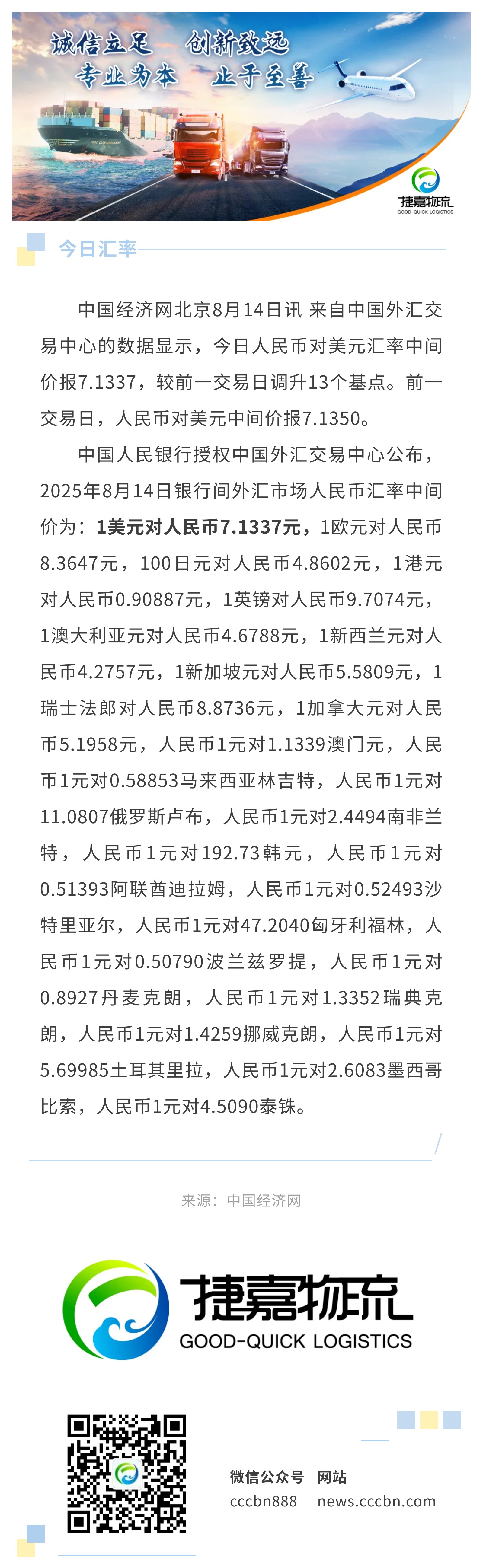 8月14日人民币兑美元中间价报7.1337,调升13个基点