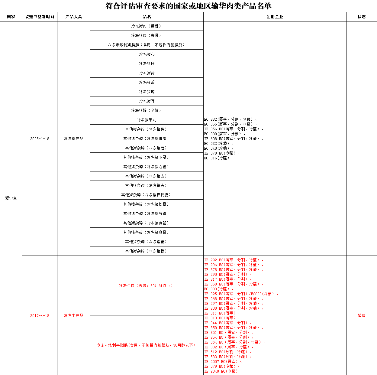 近日,海关总署更新《符合评估审查要求的国家或地区输华肉类产品名单》: