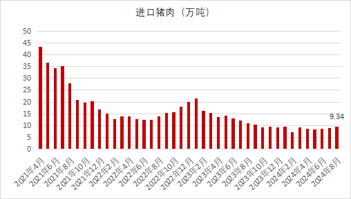1、2024年8月进口猪肉9.34万吨,环比增长5.1%,同比下降15%。