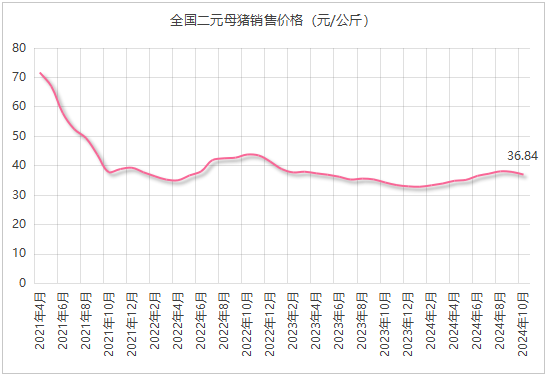 1、2024年10月份全国二元母猪销售价格36.84元/公斤,环比下跌2.4%,同比上涨7.9%;