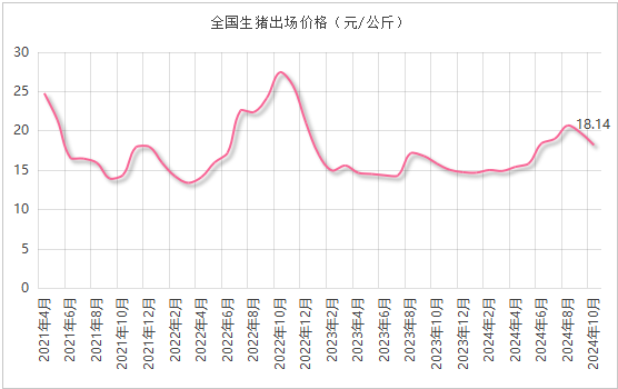 3、2024年10月份全国生猪出场价格18.14元/公斤,环比下跌7.8%,同比上涨15%。