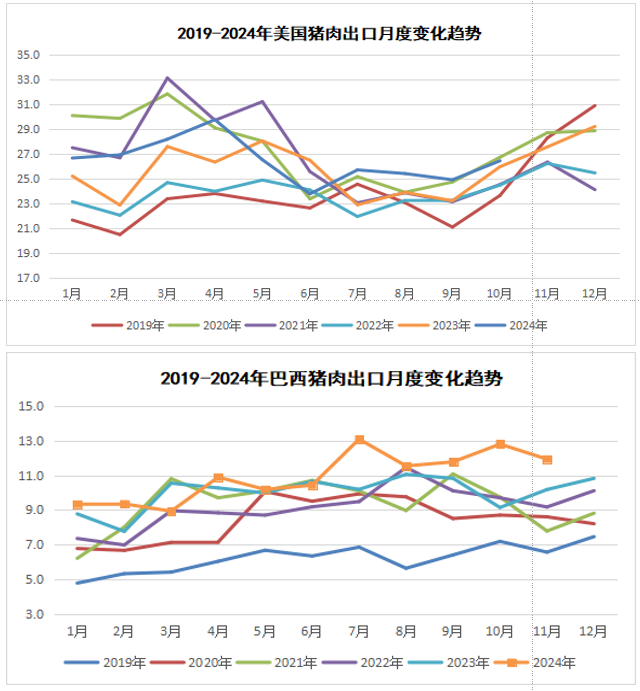 贸易方面,11月份,美国、巴西猪肉出口均同比增长。从美国看,11月份猪肉出口29.2万吨,同比增5.9%。其中,对华出口2.2万吨,同比增78.0%。1—11月猪肉出口293.4万吨,同比增4.8%。其中,对华出口18.8万吨,同比降13.0%。从巴西看,11月份猪肉出口11.9万吨,同比增17.3%。其中,对华出口2.1万吨,同比降17.2%。1—11月猪肉出口120.3万吨,同比增10.0%。其中,对华出口21.9万吨,同比降39.5%。