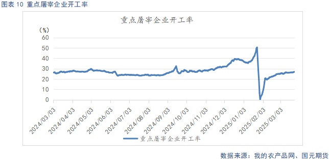 截止3月25日,重点屠宰企业开工率为26.55%,较上季度末下降11.19%。冷冻肉库容率16.91%,较上周环比上升0.1%。春节前,终端备货需求支撑下,开工率维持较高水平,小年前后达至峰值50.45%。春节期间屠企停工,节后屠企陆续开工,受返工返校后,需求逐步回暖。不过整体需求已步入季节性淡季,居民消费不足,屠企以销定宰,开工率回升缓慢,较节前峰值降幅明显。节后随着开工返校,开工率逐步回升,不过需求步入季节性淡季,开工率回升缓慢。淡季市场,鲜肉价格偏低,对冻肉需求较小,冻品去库缓慢。加之白条走货缓慢,屠企分割入库情况增多,冻肉库存节后开始小幅回升。不过经历了24年三四季度的去库存,当前冻肉库存压力不大。