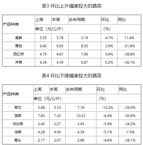 监测的19种蔬菜价格中,本周莴笋、青椒、西红柿和芹菜的价格环比涨幅较大,幅度分别为4.1%、3.9%、0.4%和0.2%(如表3所示);菜花、菠菜、洋白菜、油菜和葱头的价格环比降幅较大,幅度为10.2%、6.4%、5.4%、5.1%和4.6%(如表4所示)。
