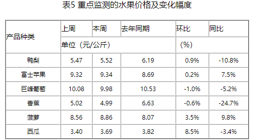 本周重点监测的6种水果平均价格为7.06元/公斤,比上周上升1.1%,同比下降3.6%(如表5所示)。