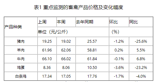 本周重点监测的畜禽产品猪肉、羊肉、牛肉、鸡蛋和白条鸡与上周相比,变化幅度在-3.6~0.2%之间(如表1所示)。