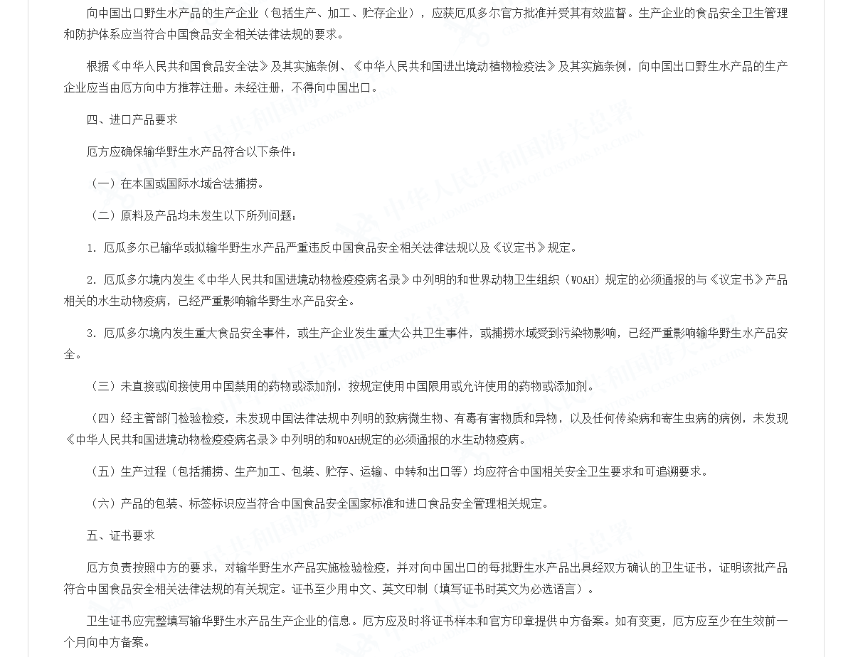 (三)《中华人民共和国海关总署与厄瓜多尔共和国生产、外贸、投资和渔业部关于厄瓜多尔输华野生水产品的检验和卫生要求议定书》(以下简称《议定书》)。