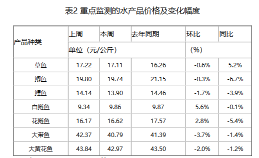本周,重点监测的水产品草鱼、鲫鱼、鲤鱼、白鲢鱼、花鲢鱼、大带鱼和大黄花鱼与上周相比,变化幅度在-3.7~5.6%之间(如表2所示)。