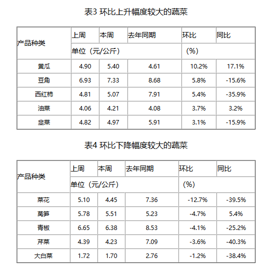 监测的19种蔬菜价格中,本周黄瓜、豆角、西红柿、油菜和韭菜的价格环比涨幅较大,幅度分别为10.2%、5.8%、5.4%、3.7%和3.1%(如表3所示);菜花、莴笋、青椒、芹菜和大白菜的价格环比降幅较大,幅度为12.7%、4.7%、4.1%、3.6%和1.2%(如表4所示)。