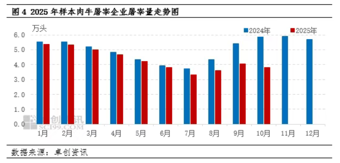 当前市场呈现国内出栏与国外进口“双增”格局,共同推动牛肉总体供应放量,前期存在的供应缺口正显著收窄。国内方面,前期产能出清效应显现,推动2025年肉牛价格进入回暖周期。市场看涨预期强化,直接刺激了中短期育肥行为的增加。同时,行业步入9-10月传统出栏高峰,季节性供应持续释放。据卓创资讯数据监测,截至9月底,样本企业肉牛出栏量达0.60万头,环比增加56.25%,同比增幅高达68.54%。尽管能繁母牛存栏的长期恢复仍显缓慢,但市场通过增加育肥量,已对短期供应形成了有效补充。