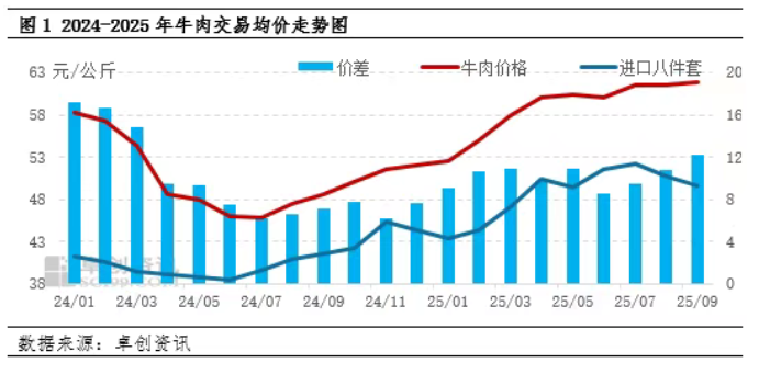 进入2025年,受国内肉牛供应整体偏紧影响,国产牛肉与进口冻品牛肉价格走势持续分化,两者价差显著扩大。根据卓创资讯监测数据,截至9月份,国内鲜牛肉月均交易价格为61.88元/公斤,环比微涨0.62%,同比涨幅达27.33%;而同期进口牛肉(以八件套为例)价格则为49.63元/公斤,环比下降2.24%,同比虽上涨19.58%,但整体价格水平显著低于国产牛肉。截至9月底,国产鲜牛肉与进口冻牛肉的价差已扩大至12.26元/公斤,环比上涨14.13%,同比增幅高达72.61%,处于近两年来的最高水平。这一不断拉大的价差,成为推动牛肉进口量增长的核心底层逻辑。