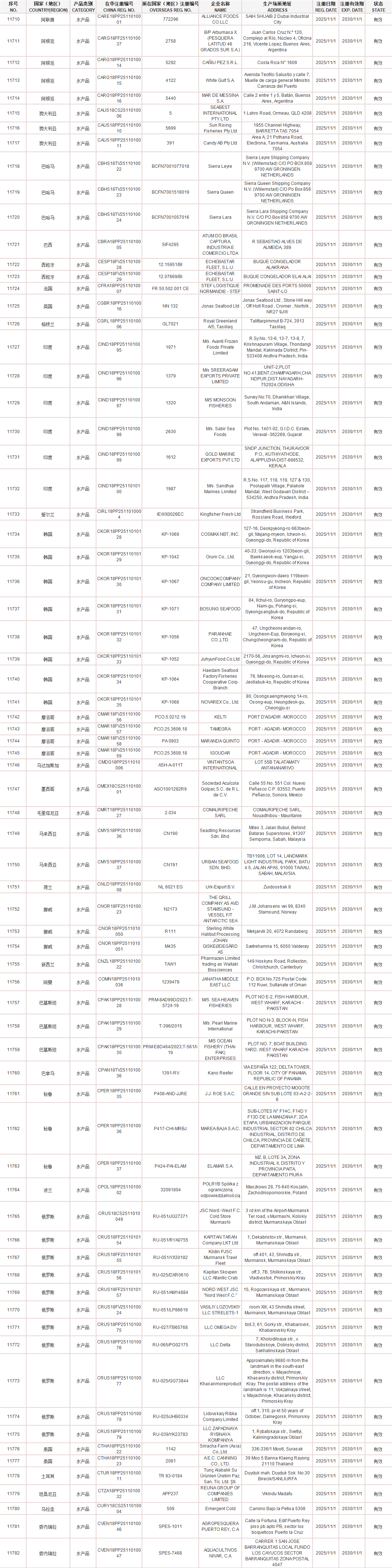 2.海关总署新增阿根廷4家水产品企业输华注册(注册编码为:2758、5292、4122、5440)自2025年11月1日及之后生产的符合中国要求的水产品允许输华。