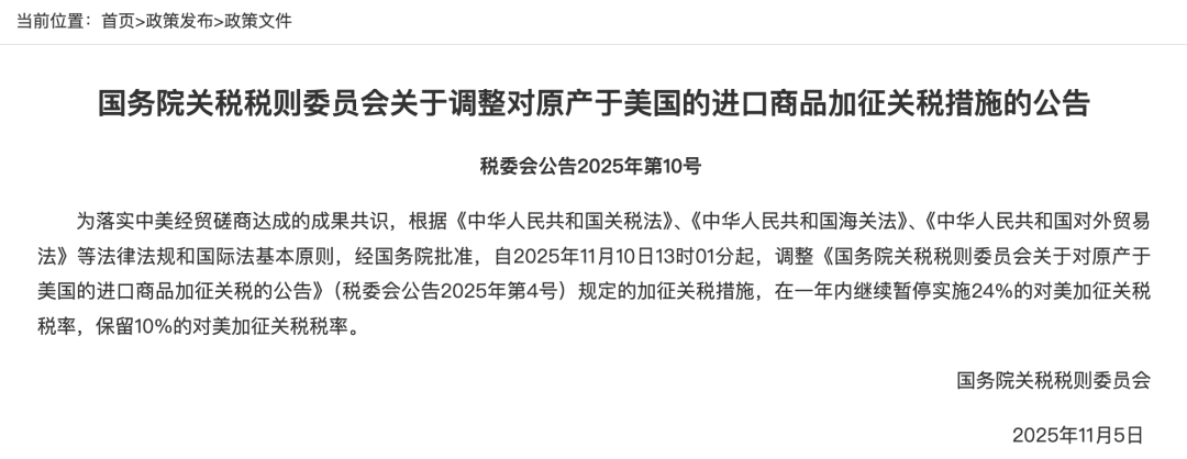 为落实中美经贸磋商达成的成果共识,根据《中华人民共和国关税法》、《中华人民共和国海关法》、《中华人民共和国对外贸易法》等法律法规和国际法基本原则,经国务院批准,自2025年11月10日13时01分起,调整《国务院关税税则委员会关于对原产于美国的进口商品加征关税的公告》(税委会公告2025年第4号)规定的加征关税措施,在一年内继续暂停实施24%的对美加征关税税率,保留10%的对美加征关税税率。