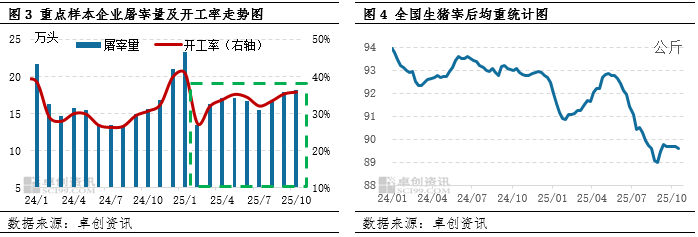 根据猪肉理论猪肉产量=生猪屠宰量*宰后均重这一公式推算,2025年1-10月猪肉理论产量同比增加。根据卓创资讯数据监测显示,2024年均日度屠宰量16.08万头,同比下降13.39%;2024年均宰后均重93.00公斤,同比微降0.05%。而2025年1-10月平均日度屠宰量17.18万头,同比上涨10.98%;1-10月平均宰后均重91.00公斤,同比下跌2.24%。生猪屠宰体重虽受政策影响,持续降重,但从数据角度看,2025年减重速度远不及宰量增幅。