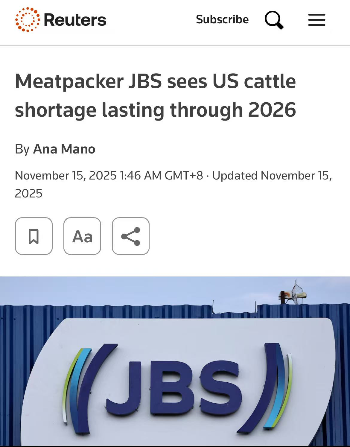 在主要市场美国面临挑战的同时,JBS在其大本营巴西则通过长期供货协议和持续的养殖技术提升,以缓冲当地预计的牛群规模收缩带来的影响。综合来看,JBS管理层判断,美国牛只供应问题将至少持续至2026年,行业真正的复苏需要到2027年后才会逐步显现。