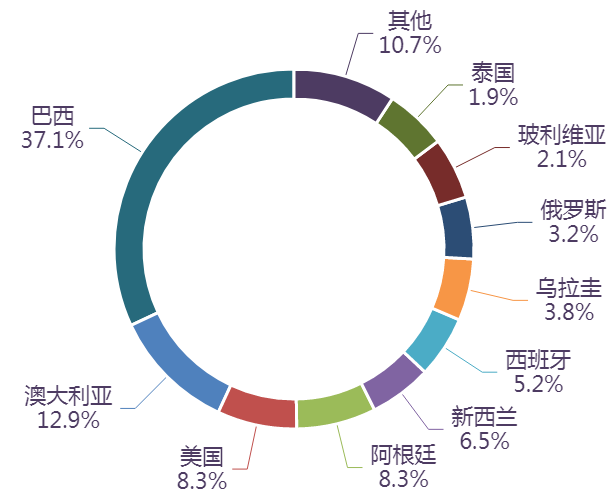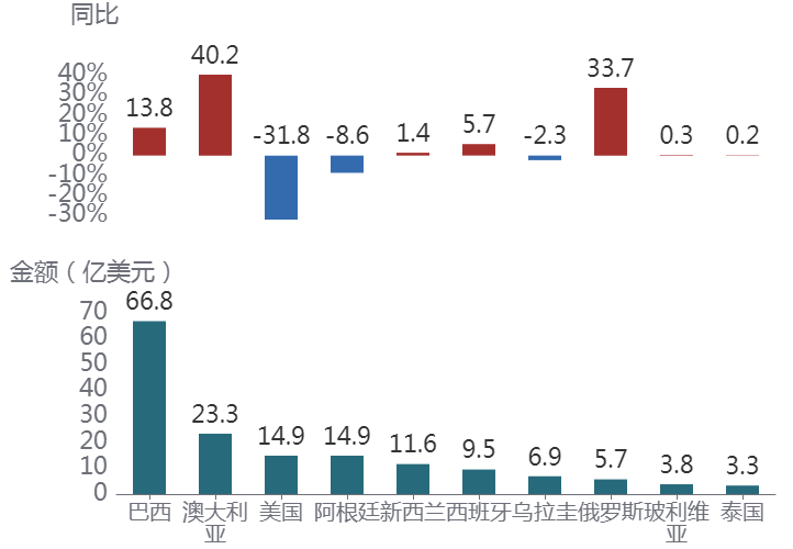 前9个月,巴西是我国肉类及制品进口最主要的市场,进口额为66.8亿美元,同比增长13.8%。9月当月,进口额为10.1亿美元,同比增长61.1%。