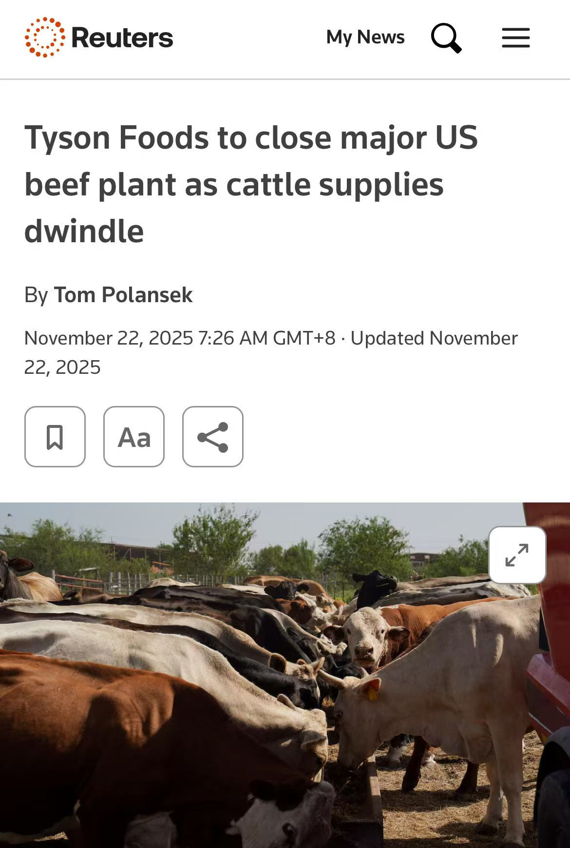 泰森食品关闭核心牛肉工厂,美国牛群供应跌至75年新低