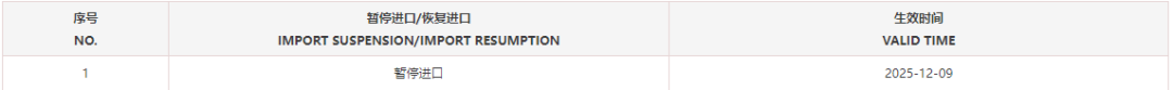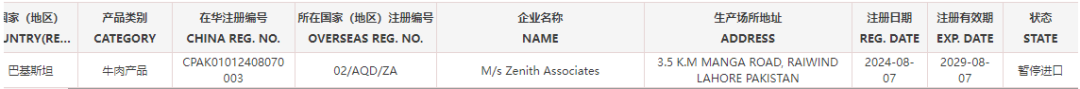 暂停受理巴基斯坦1家牛肉企业(注册编码为:02/AQD/ZA)自2025年12月9日(含)起启运的输华产品进口申报。