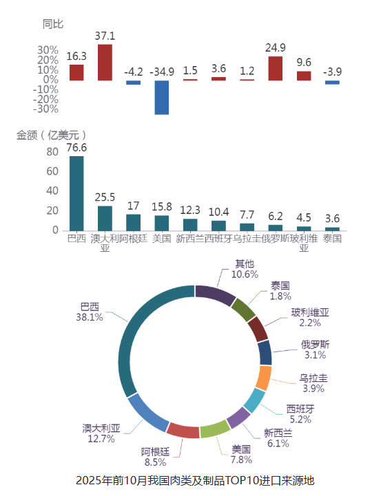 前10个月,巴西是我国肉类及制品进口最主要的市场,进口额为76.6亿美元,同比增长16.3%。10月当月,进口额为9.8亿美元,同比增长36.2%。