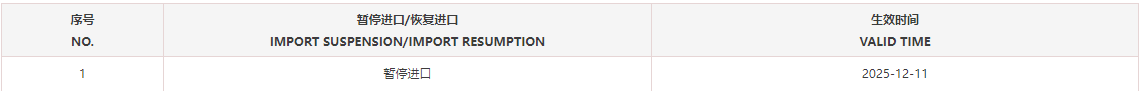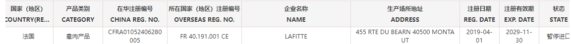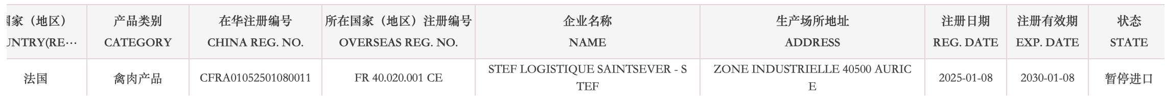 暂停受理法国2家禽肉企业(注册编码为:FR40.020.001CE、FR40.191.001CE)自2025年12月11日(含)起启运的输华产品进口申报。