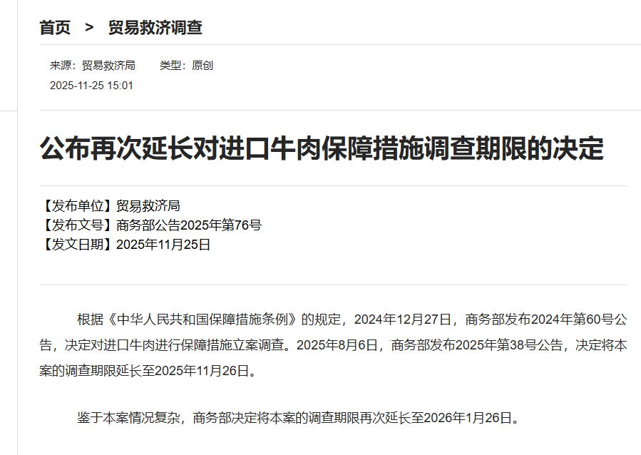 针对进口牛肉的保障措施进展,中国商务部此前已决定将调查期限延长至2026年1月26日。根据近日外媒消息,相关措施的具体结果预计将于近期公布。让我们共同关注后续进展。