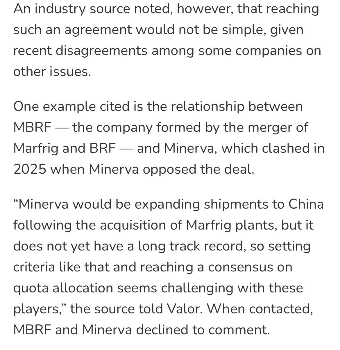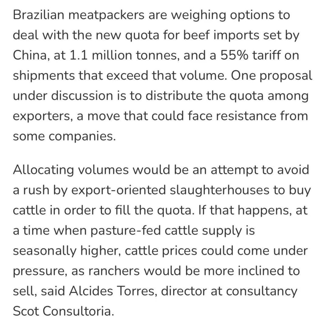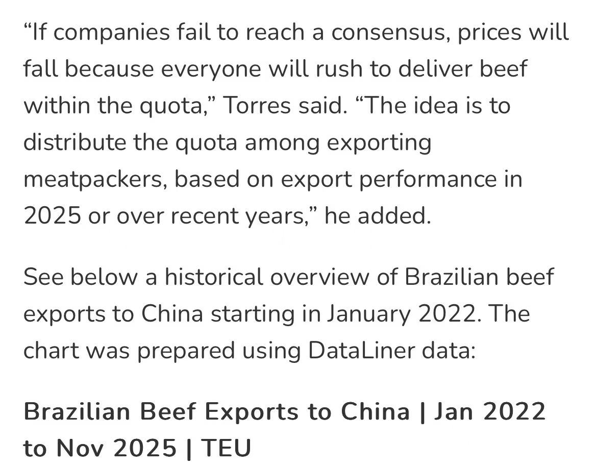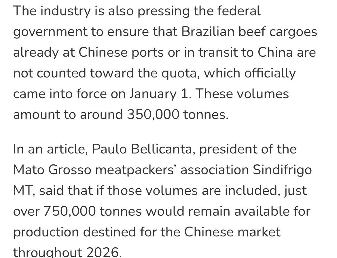 为避免企业为抢占配额集中采购活牛导致价格波动,行业考虑按企业以往出口业绩分配额度,但该提议可能因企业间存在分歧而难以落实。与此同时,行业呼吁巴西政府与中国协商,将已抵达或运输中的约35万吨牛肉排除在配额计算之外,否则2026年实际可用配额将大幅减少。