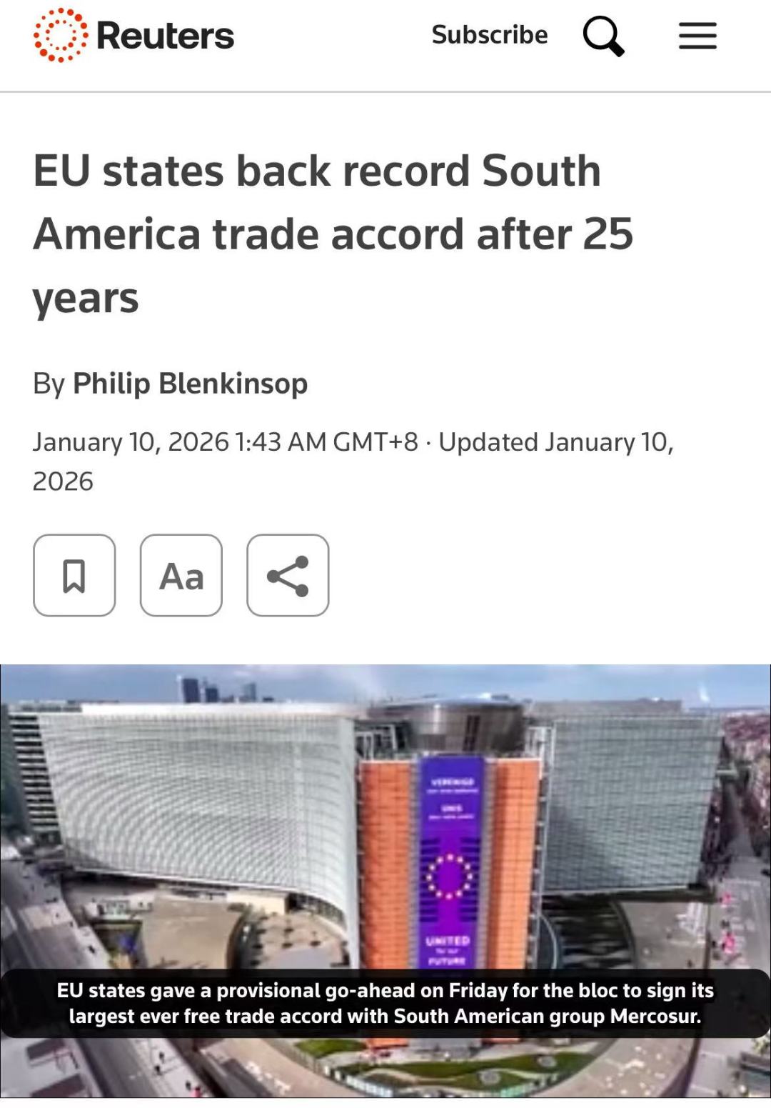 在历经四分之一世纪的艰难谈判后,欧盟与南美南方共同市场(Mercosur)的自由贸易协定终于冲破最后一道内部障碍。尽管法国等国因担心冲击本土农业而激烈反对,欧盟多数成员国仍在1月9日投票支持,为这项划时代协议的签署扫清道路。