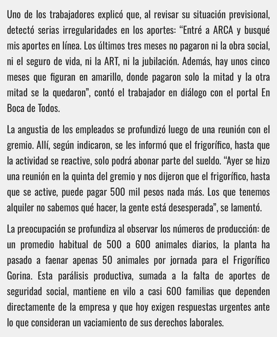 拉潘帕省 General Pico 市的 Frigorífico General Pico S.A.(厂号 2531/2792)正处风暴眼:屠宰量从日常 500-600 头暴跌至约 50 头,且主要为代加工订单;工资发放不规范,年终奖金被拆分、圣诞礼盒取消;更严峻的是,员工在 ARCA 系统查询发现,医保、养老金等记录出现连续“空白”(未申报)或“黄标”(欠缴)。