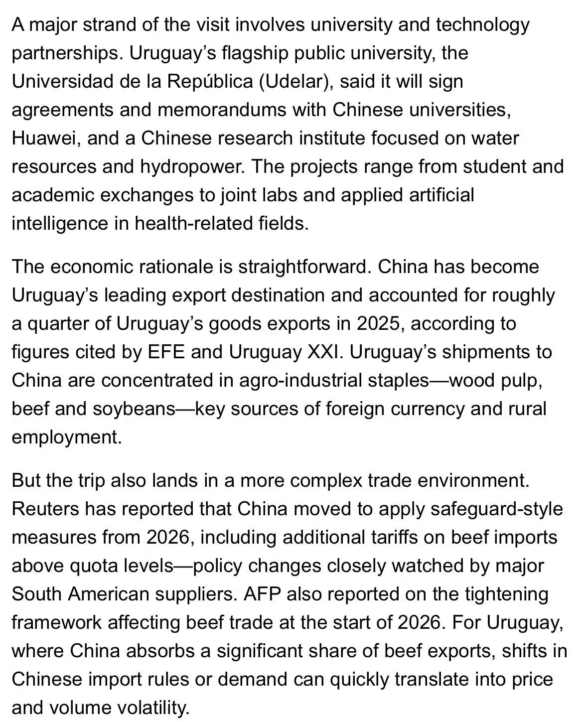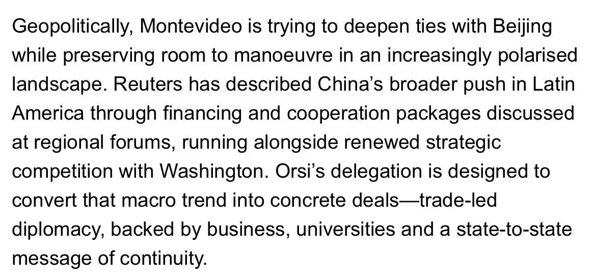 乌拉圭肉类行业视此访为推动对华牛肉贸易的重要契机。该国已获直至2028年底的32.4万吨对华牛肉出口配额,优于巴西、阿根廷等主要竞争对手。访问期间将正式在华启动新一轮乌拉圭牛肉推广活动,面向高端餐饮与进口商,旨在提升高价值部位肉的销售定位。