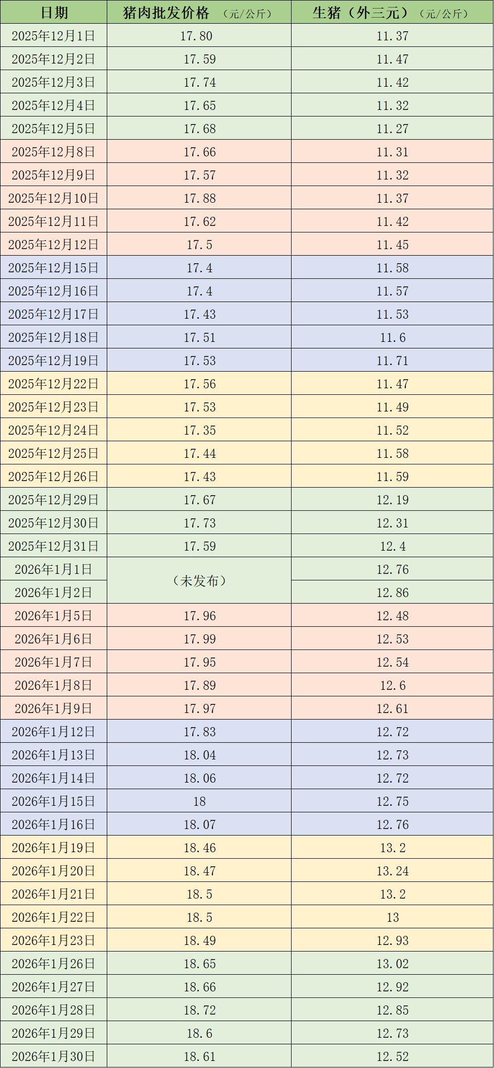 据农业农村部监测,1月30日,全国农产品批发市场猪肉平均价格为18.61元/公斤,与上周五(1月23日)的18.49元/公斤相比,上涨0.6%。本周的平均价格为18.65元/公斤,与上周18.5元/公斤的均价相比,上涨0.8%。