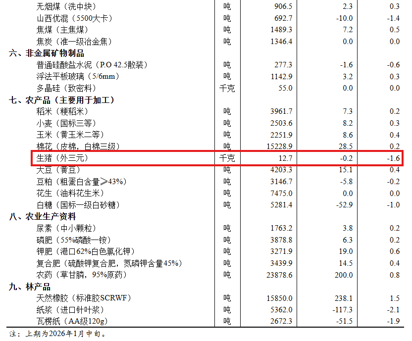 据对全国流通领域9大类50种重要生产资料市场价格的监测显示,2026年1月下旬与1月中旬相比,25种产品价格上涨,21种下降,4种持平。其中,生猪(外三元)价格为12.7元/千克,环比下降1.6%。