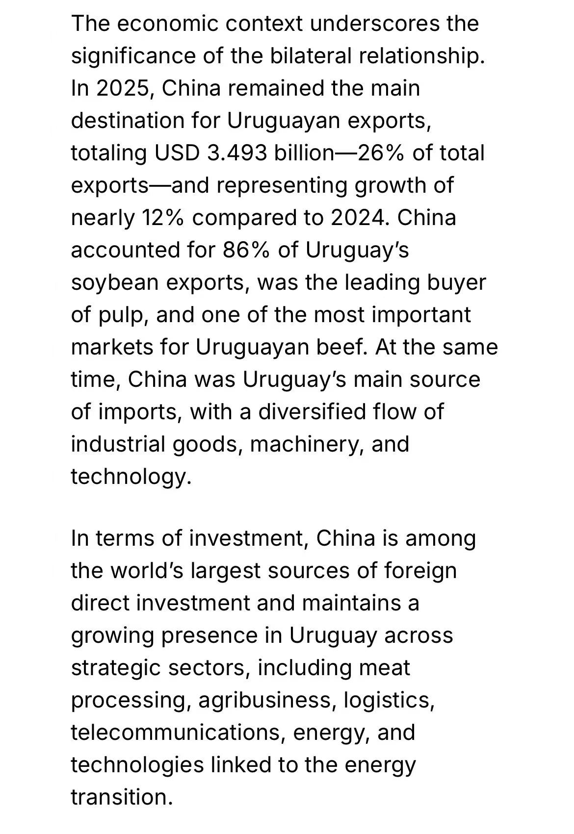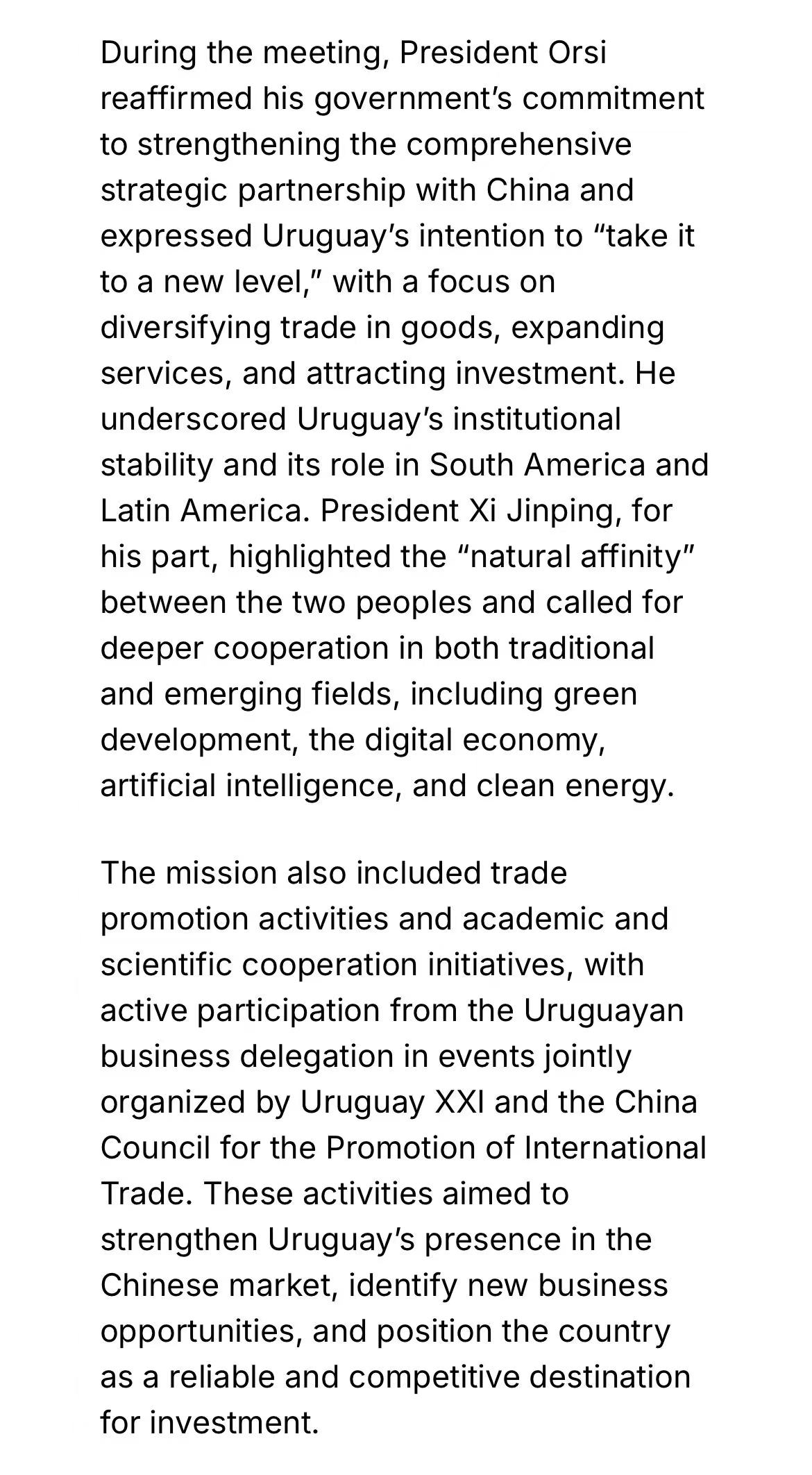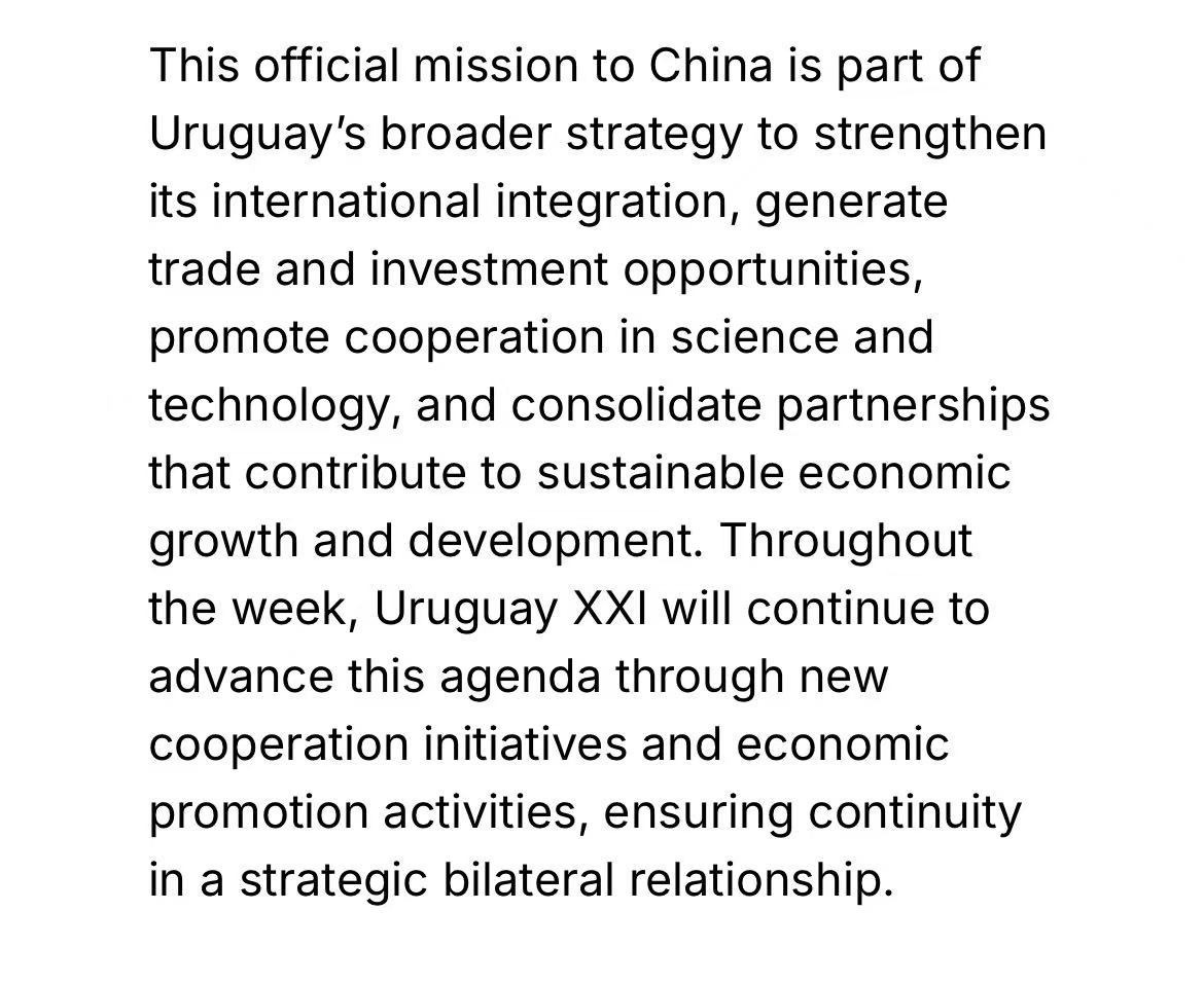 此次访问还涉及贸易、投资、科技与环保等多领域合作,凸显中国作为乌拉圭最大贸易伙伴的战略重要性。双方同意在绿色发展、数字经济等领域挖掘新机遇,进一步强化全面战略伙伴关系,为乌拉圭的国际融合与可持续发展注入动力。