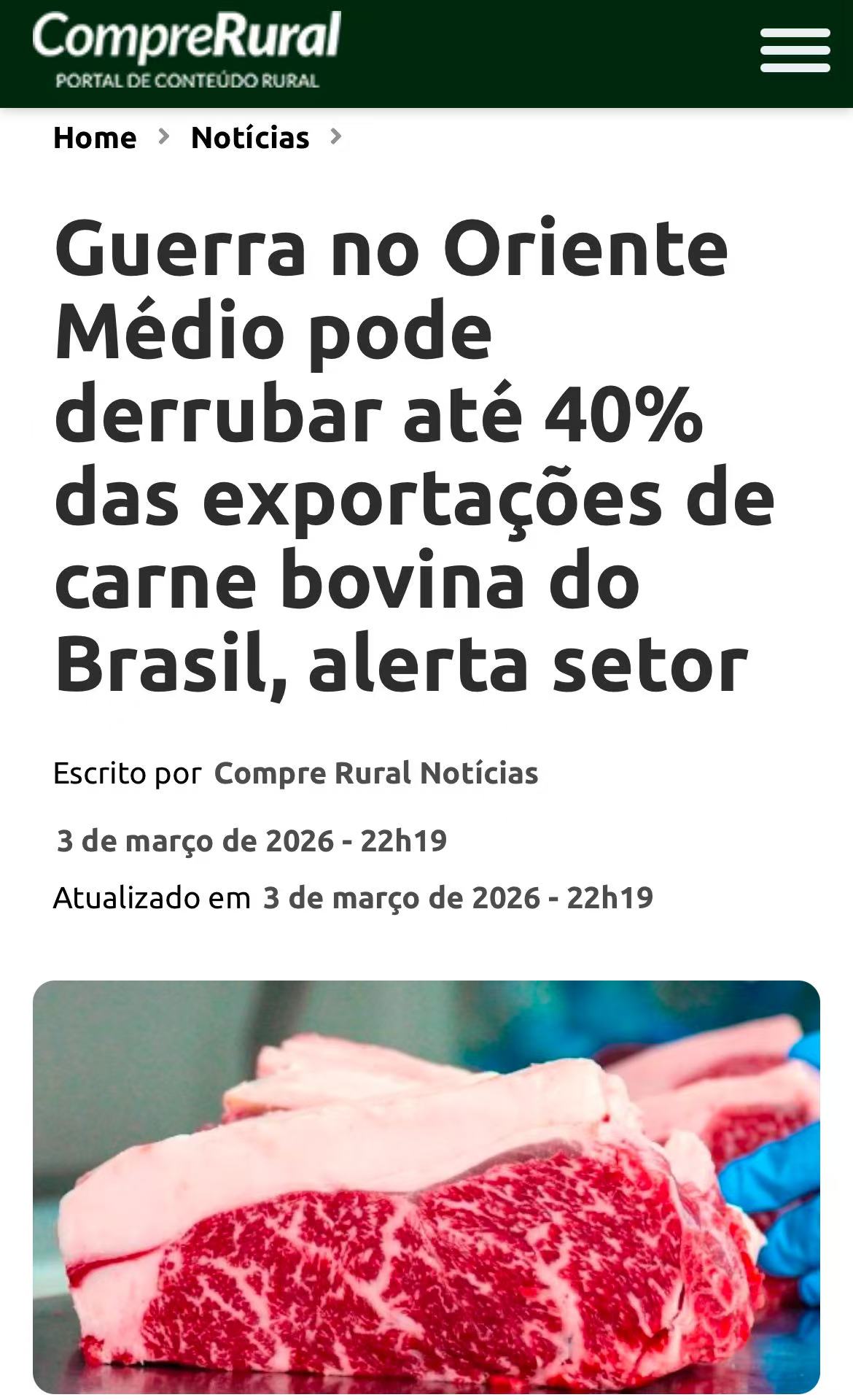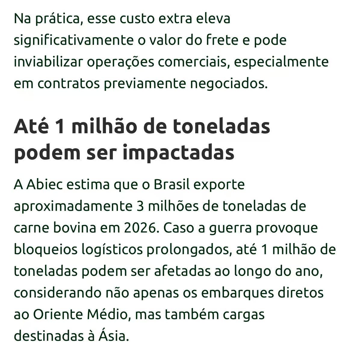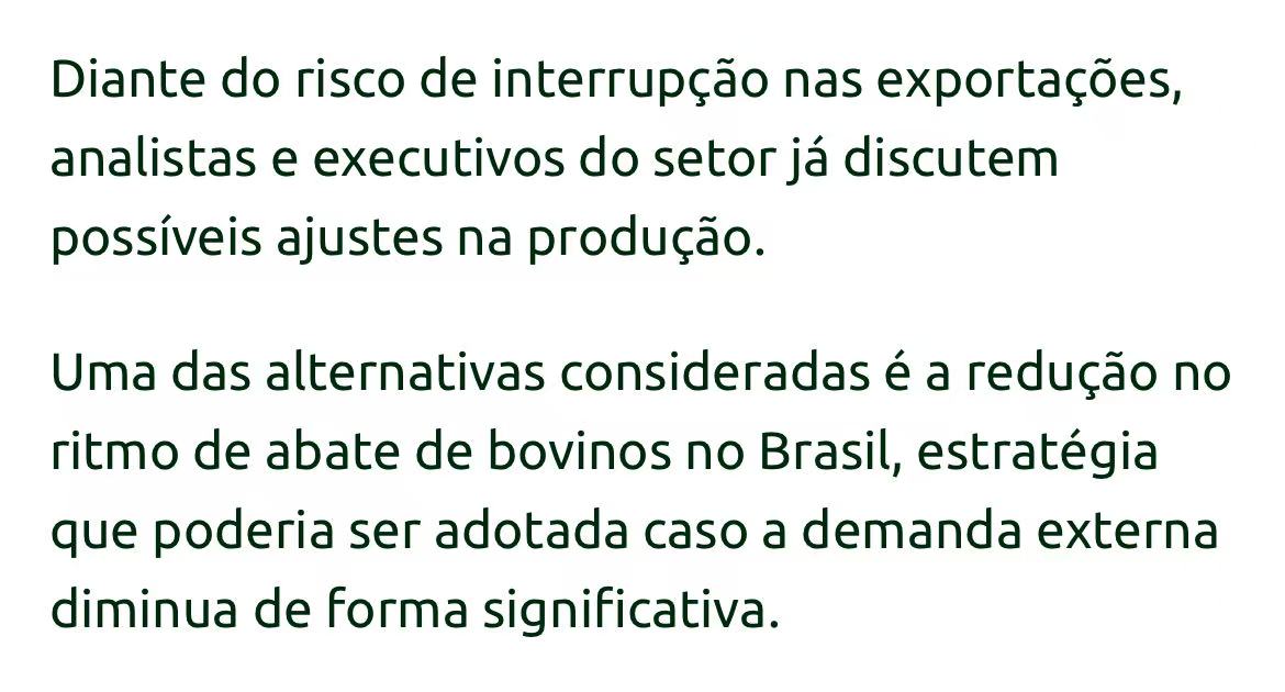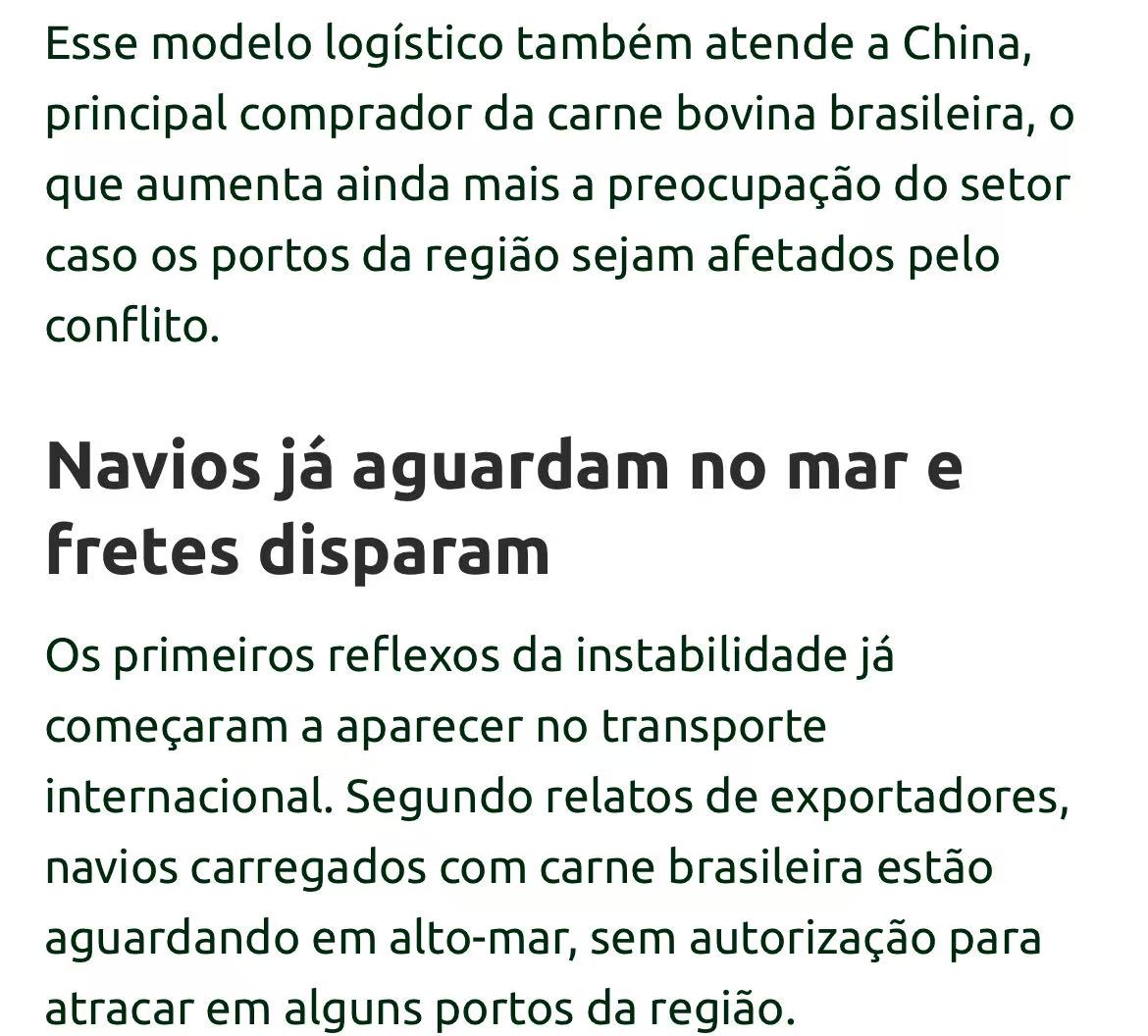 巴西肉类出口商协会(Abiec)主席佩罗萨警告说,美国、以色列与伊朗的冲突,可能影响到巴西30%到40%的牛肉出口。