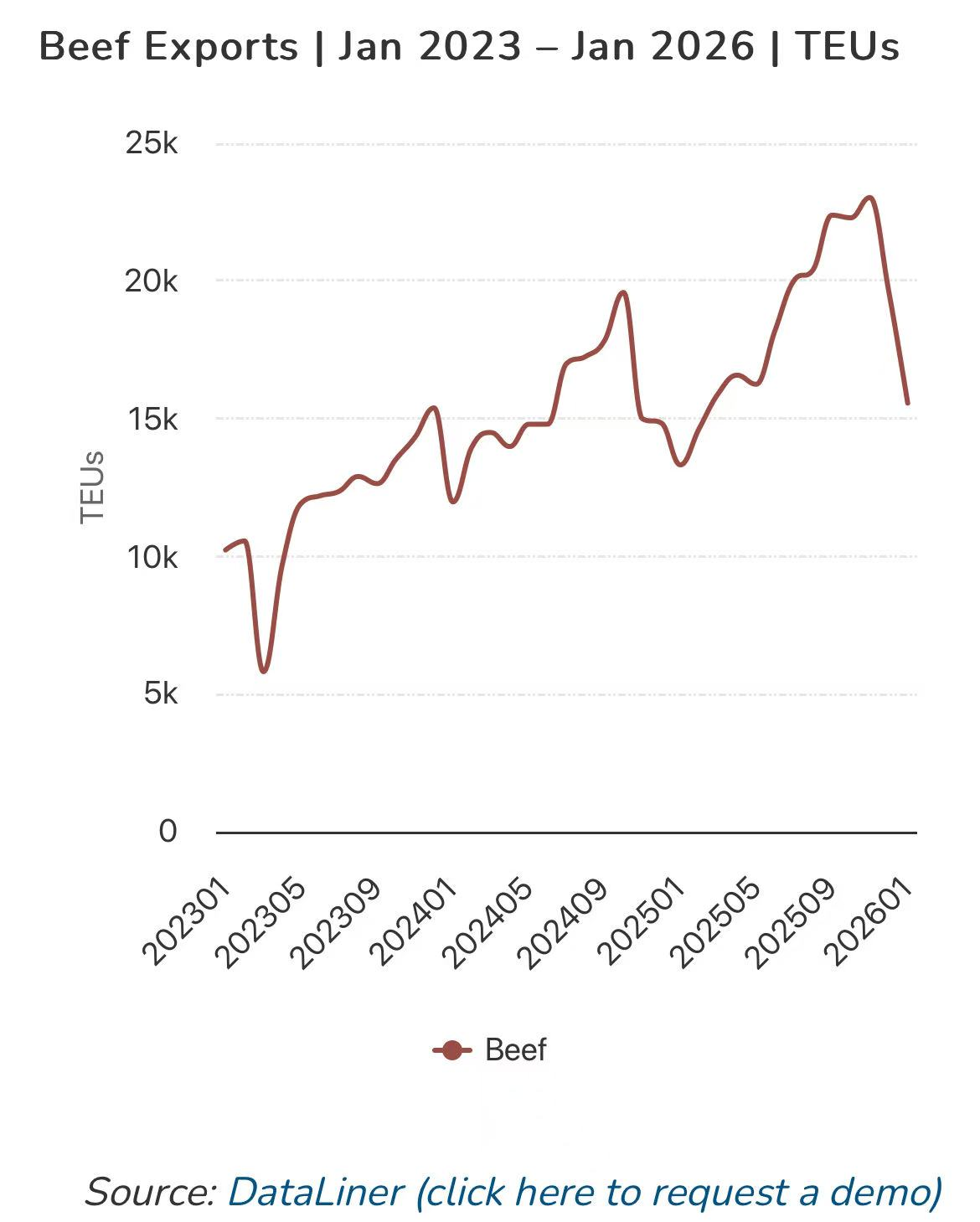 当月鲜冻牛肉出口量23.589万吨,同比增长23.9%;出口收入13.31亿美元,同比增长41.8%。出口均价5640.85美元/吨,同比上涨14.5%。