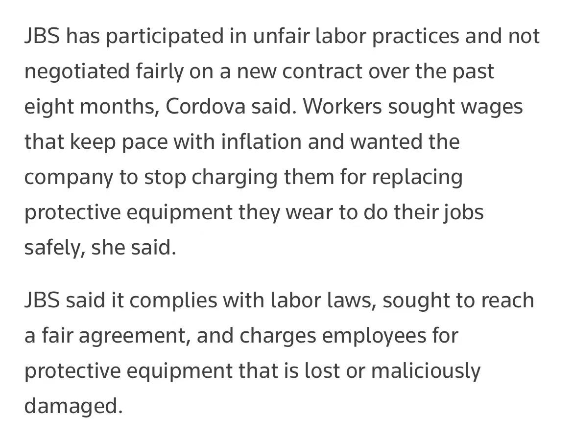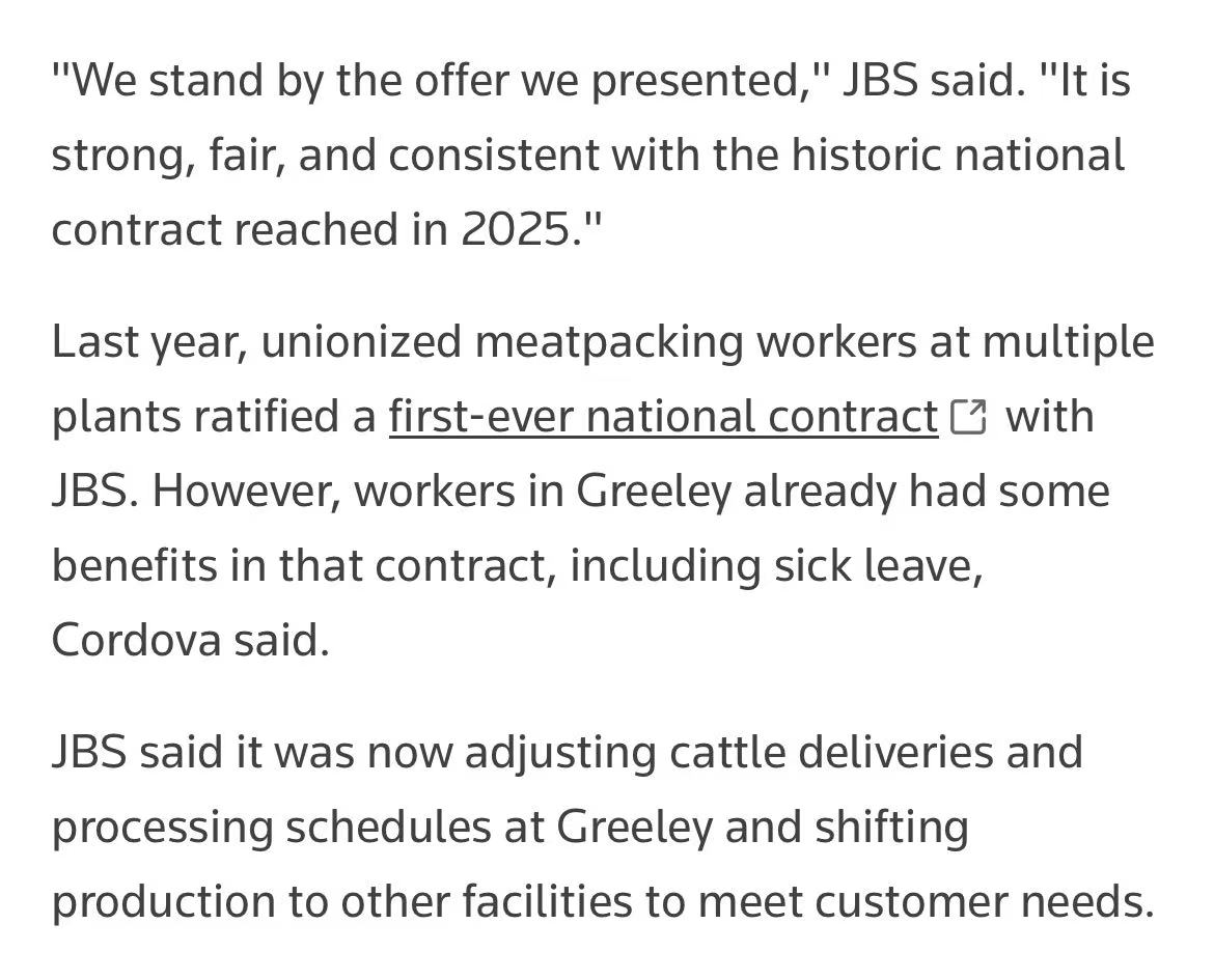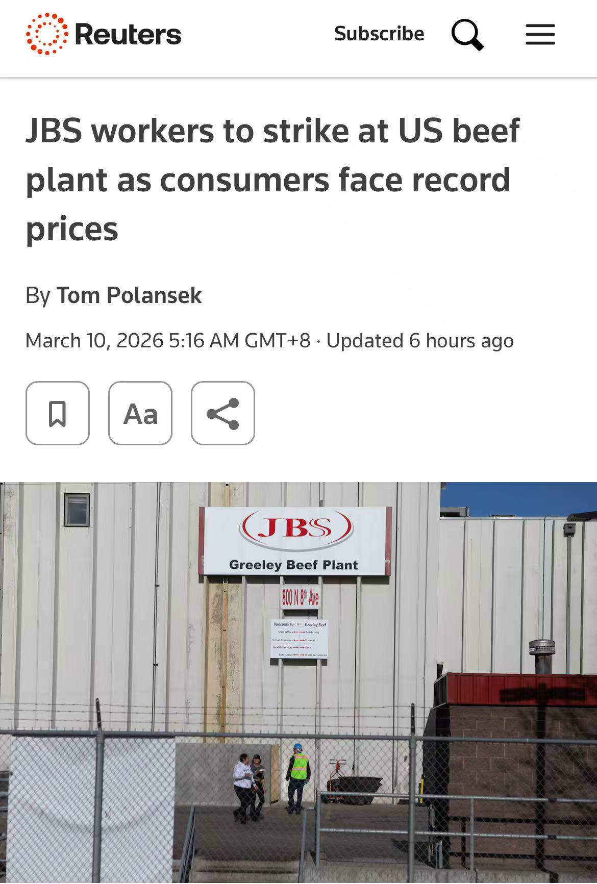 约3800名工人计划从3月16日起在JBS格里利工厂罢工,劳资谈判已僵持8个月。工会称工资跟不上通胀,JBS则表示方案公平,已准备将产能转移至其他工厂。