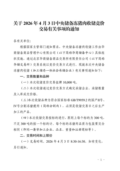 关于2026年4月3日中央储备冻猪肉收储竞价交易有关事项的通知